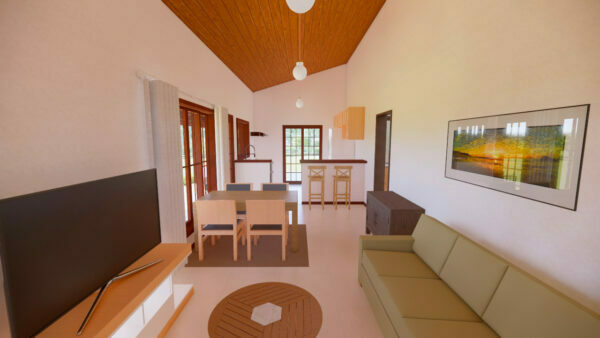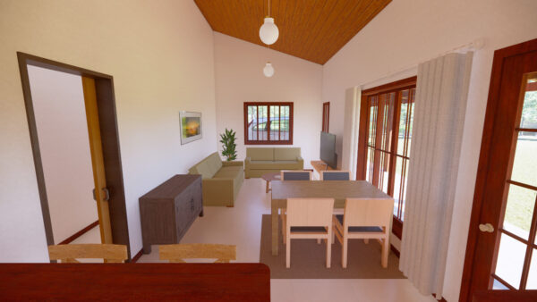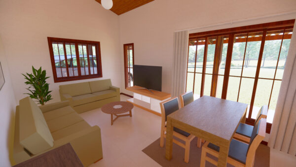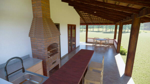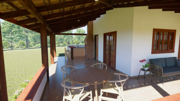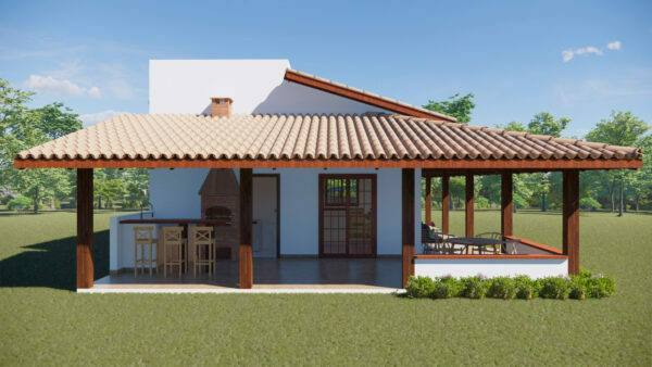 Casa com grande varanda em “L”, com área de lazer e de churrasco, além de vaga para carro. No interior, possui sala de estar, jantar e cozinha integradas. Na varanda, contempla ainda uma área de serviço. Com 2 quartos, sendo 1 deles suíte, a casa foi projetada levando em conta uma ótima iluminação e ventilação natural.