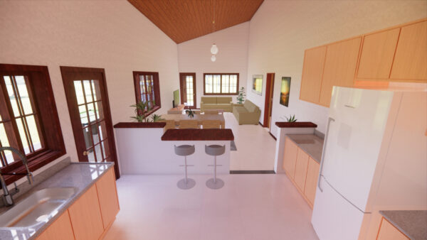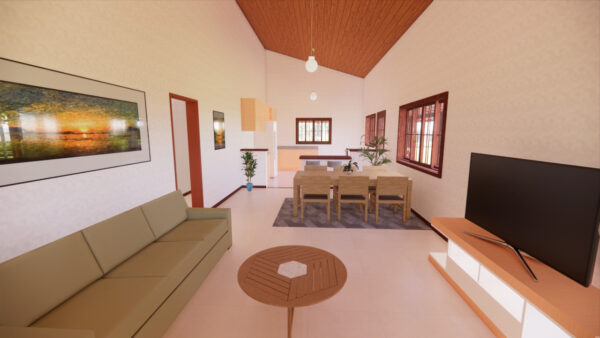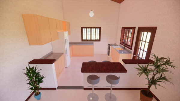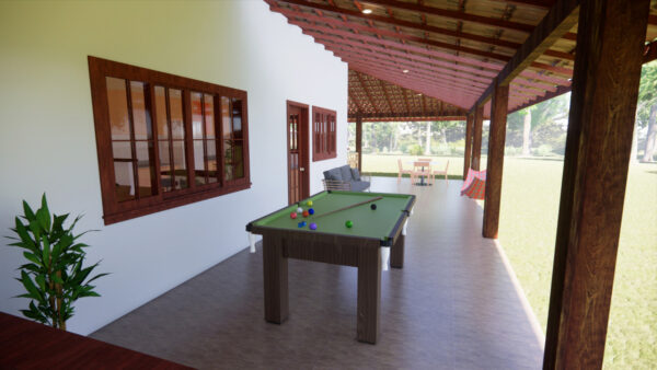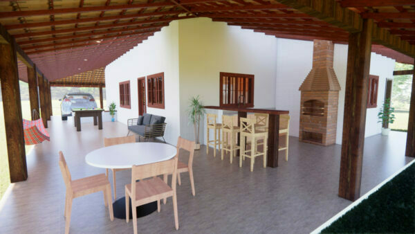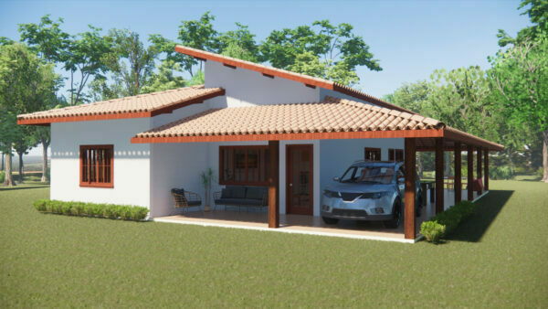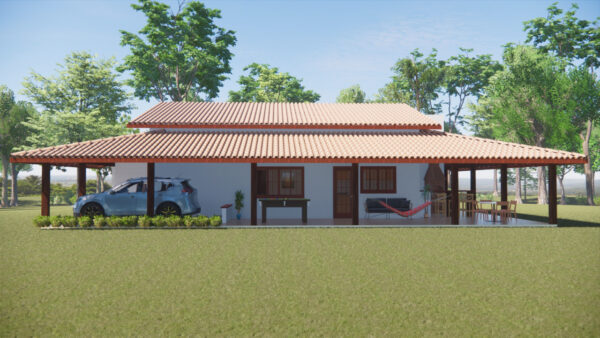 Uma casa elegante, com varanda de ótimo tamanho rodeando a frente, lateral e fundo da casa. A varanda possui área de churrasco espaçosa, área de serviço e lavabo, além de abrigar vaga para carro. Na parte interna, tem a sala de estar, sala de jantar e cozinha integradas. Com 3 quartos, sendo 1 deles suíte, a casa foi projetada levando em conta uma ótima iluminação e ventilação natural.