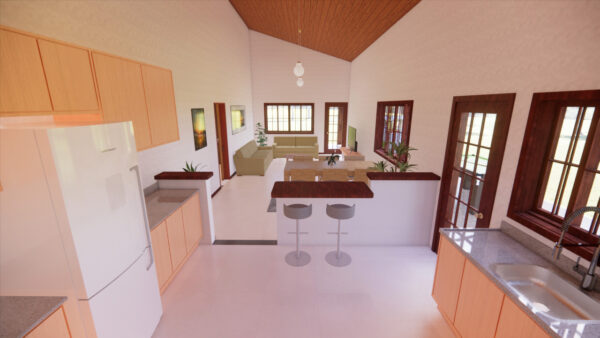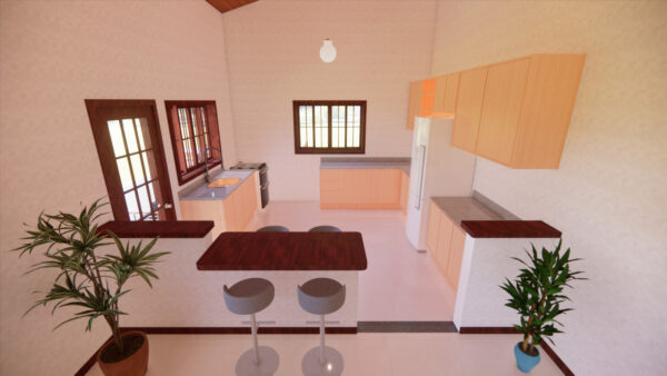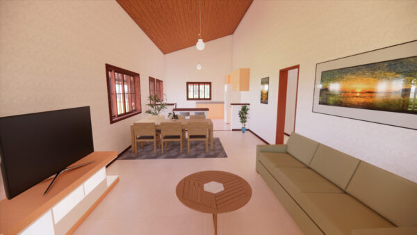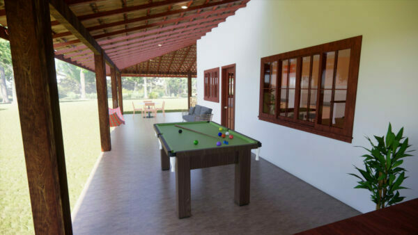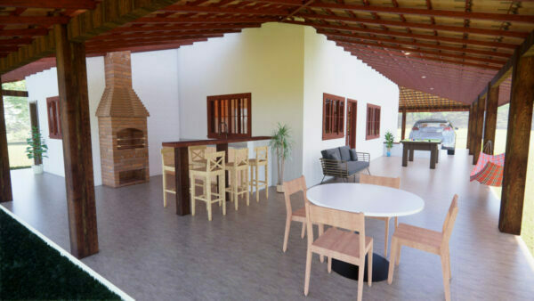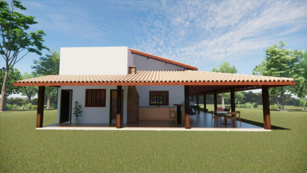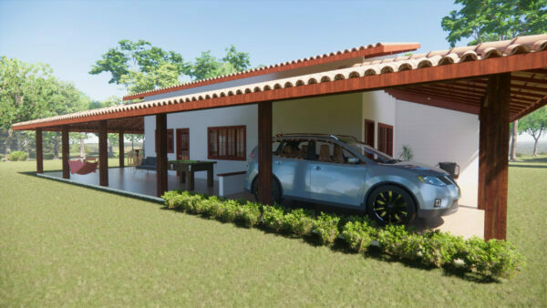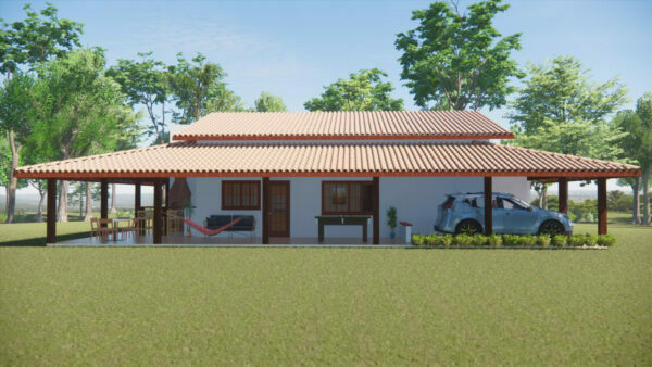 Uma casa elegante, com varanda de ótimo tamanho rodeando a frente, lateral e fundo da casa. A varanda possui área de churrasco espaçosa, área de serviço e lavabo, além de abrigar vaga para carro. Na parte interna, tem a sala de estar, sala de jantar e cozinha integradas. Com 3 quartos, sendo 1 deles suíte, a casa foi projetada levando em conta uma ótima iluminação e ventilação natural.
