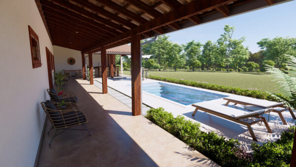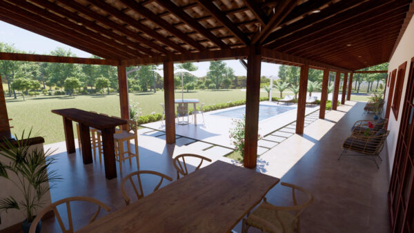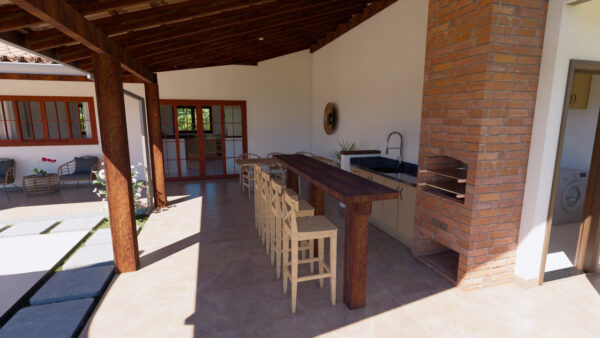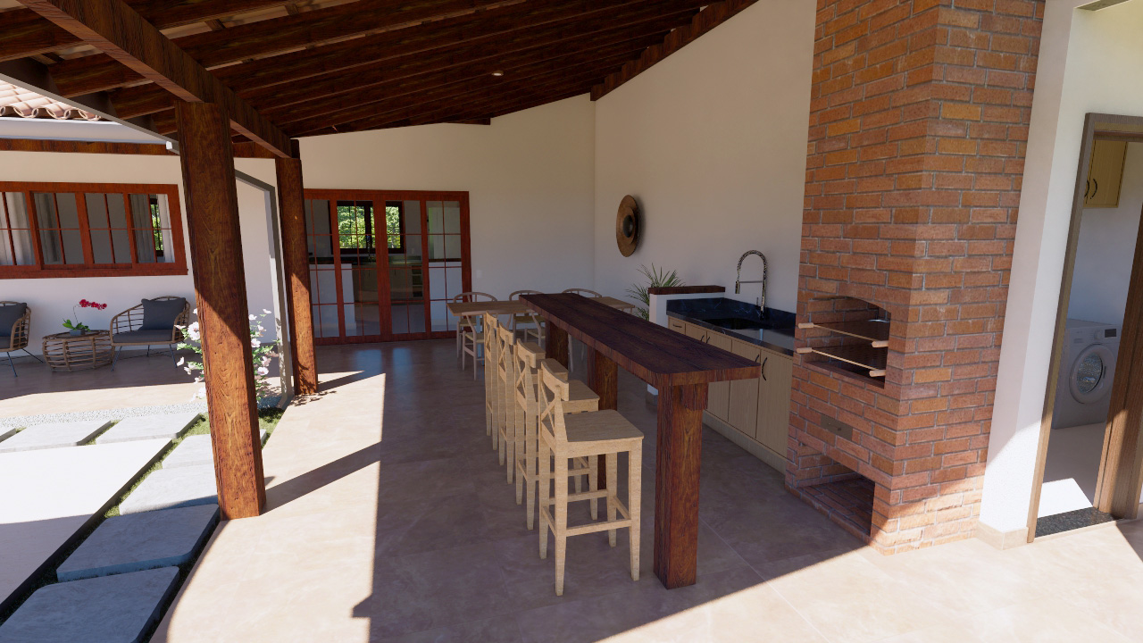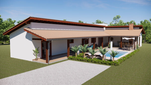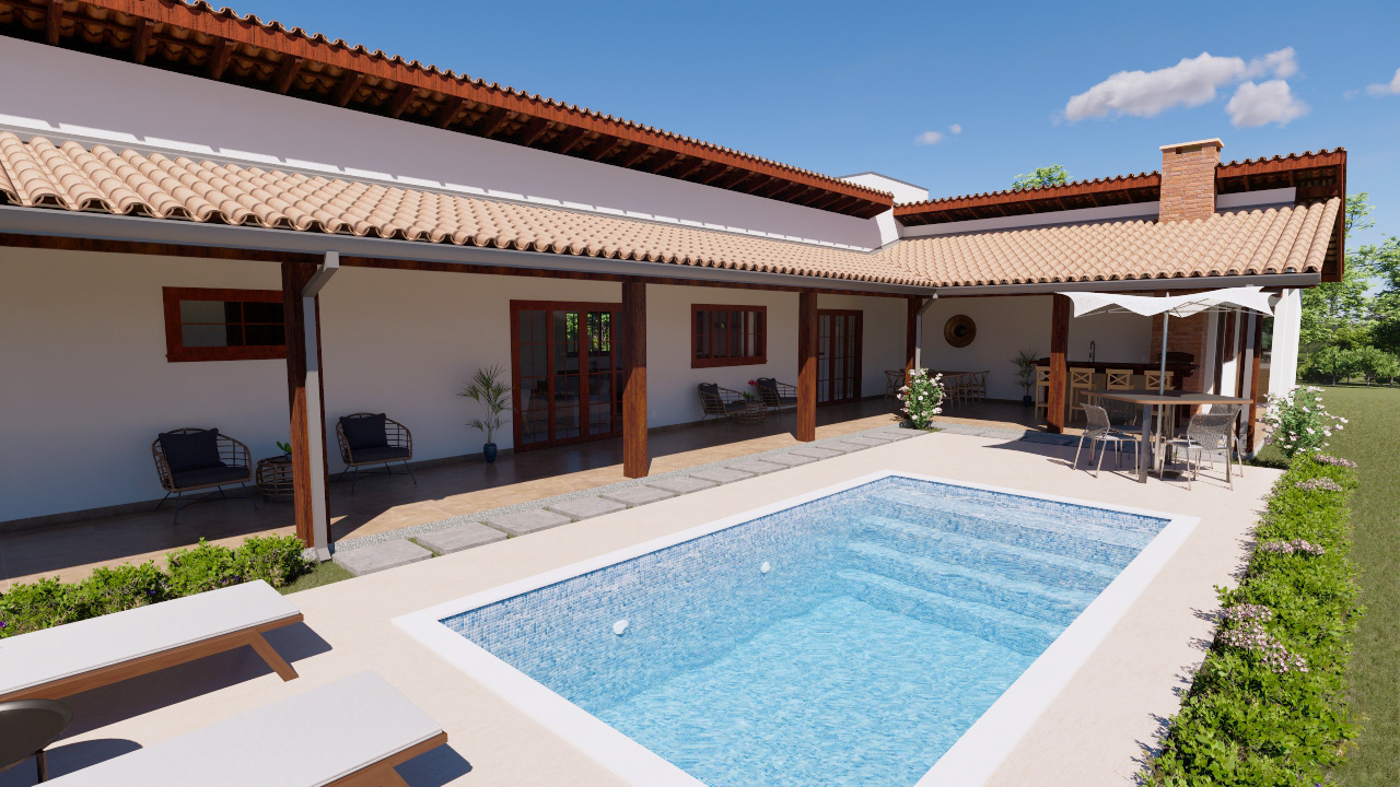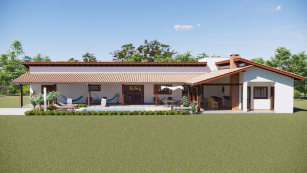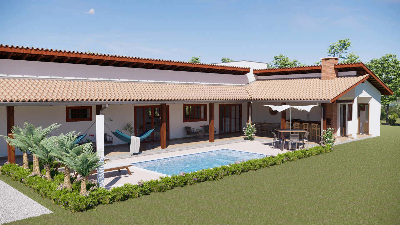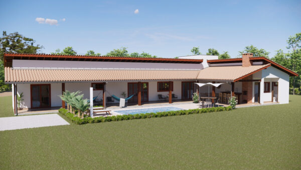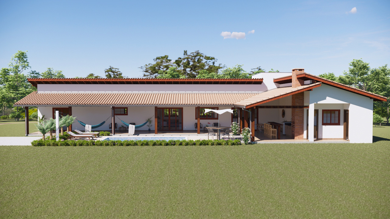 Casa de campo em formato L, com varanda, área gourmet e piscina. A varanda abriga uma ótima área de lazer com churrasqueira e banheiro externo, além de área de serviço. No interior, possui sala de estar e jantar integradas com a cozinha. Com 4 quartos, sendo 3 deles suíte, a casa foi projetada levando em conta uma ótima iluminação e ventilação natural.
