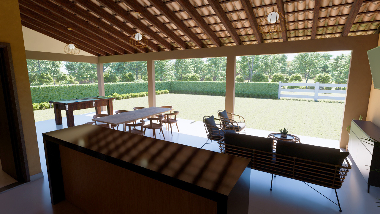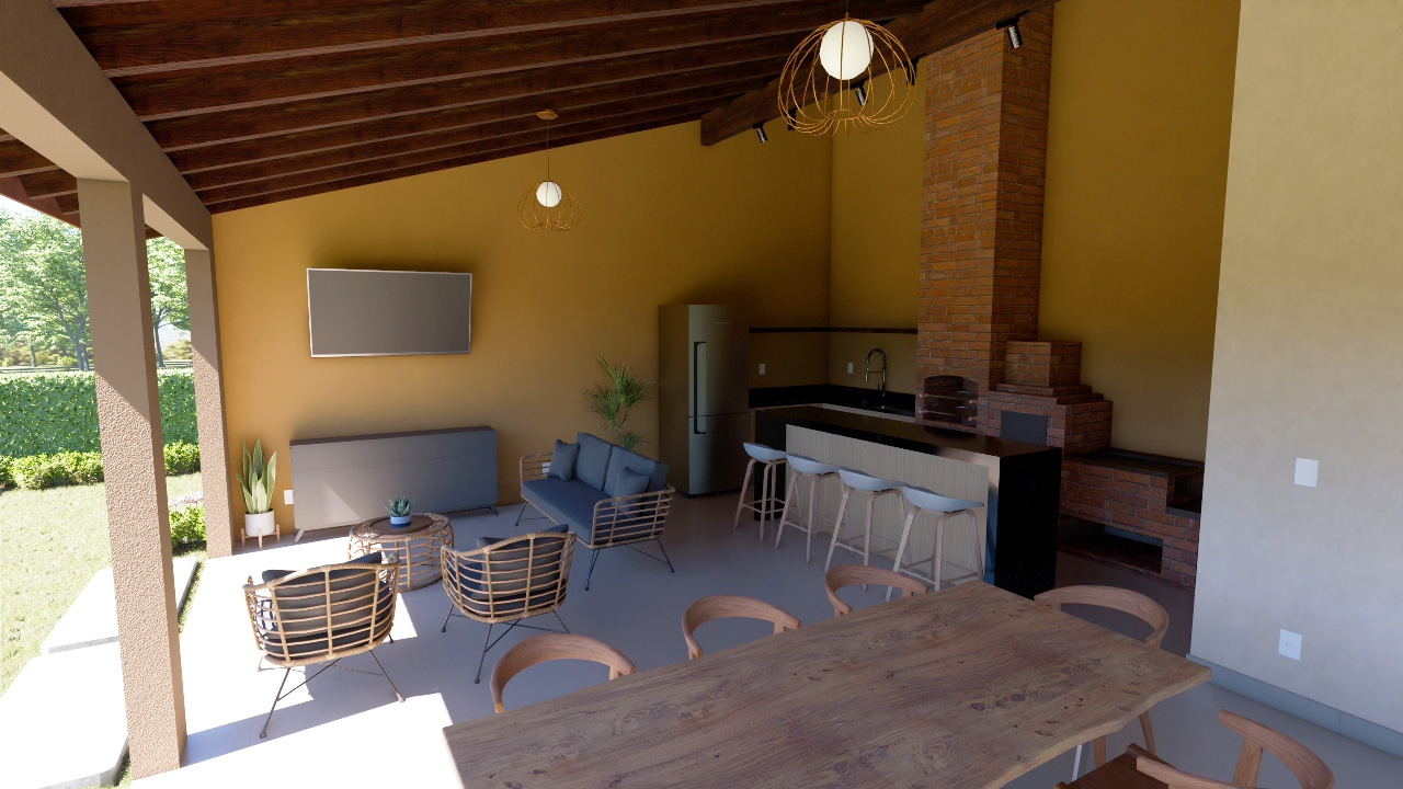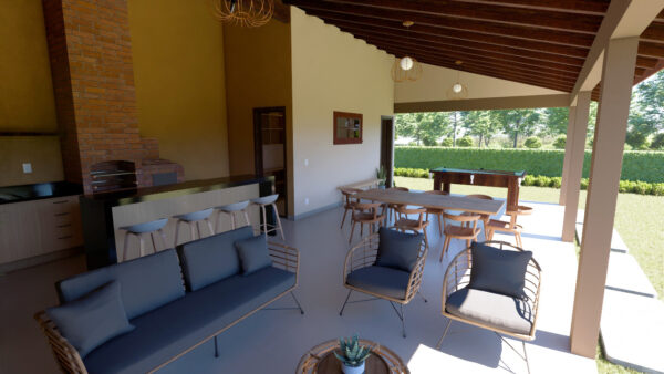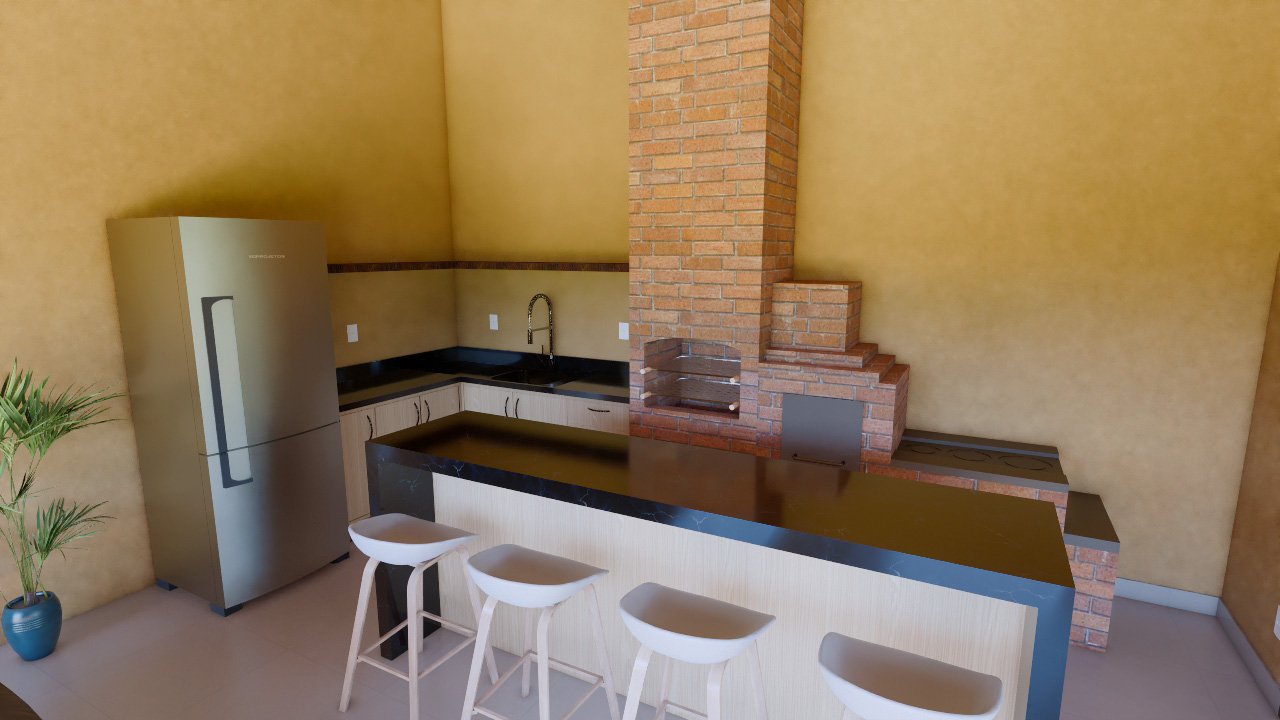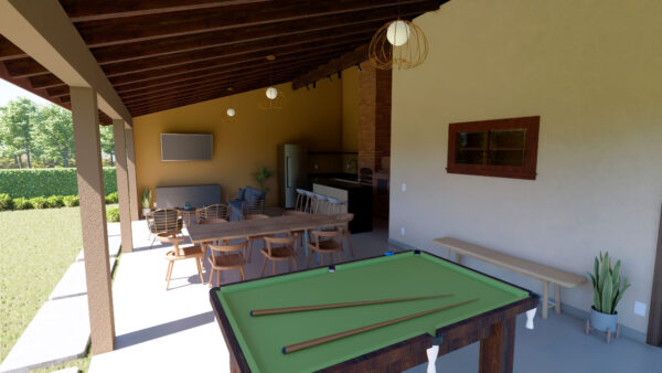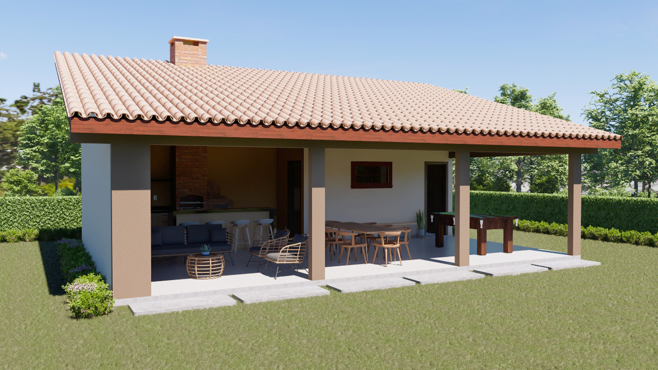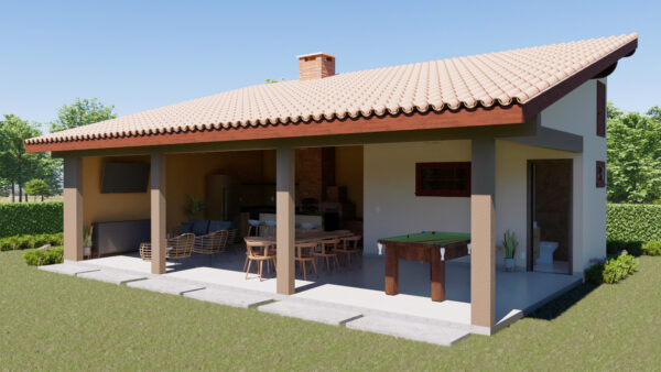 Edícula com área gourmet com área para churrasco, forno a lenha (opcional), sinuca, lavabo e despensa. A edícula foi projetada para integrar áreas externas de casas, servindo como área gourmet e de lazer. Pode ser instalada junto a piscinas, nos fundos ou laterais de terrenos.